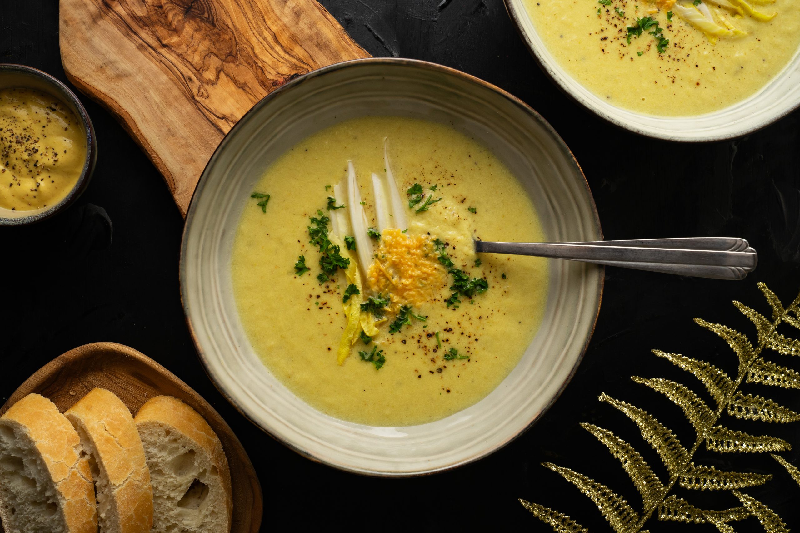 Deze feestelijke witlof-mosterd soep is een romig en smaakvol voorgerecht dat perfect past bij een speciale gelegenheid. De zachte witlof, aardappel en room vormen de basis, terwijl mosterd en kerrie zorgen voor een subtiele pittige twist. Werk de witlof-mosterd soep af met krokante pecorino-koekjes, verse peterselie en ciabatta en de gasten zullen smullen. Een combinatie van witlof met mosterd maakt de lekkerste mosterdsoep die je ooit hebt geproefd.
