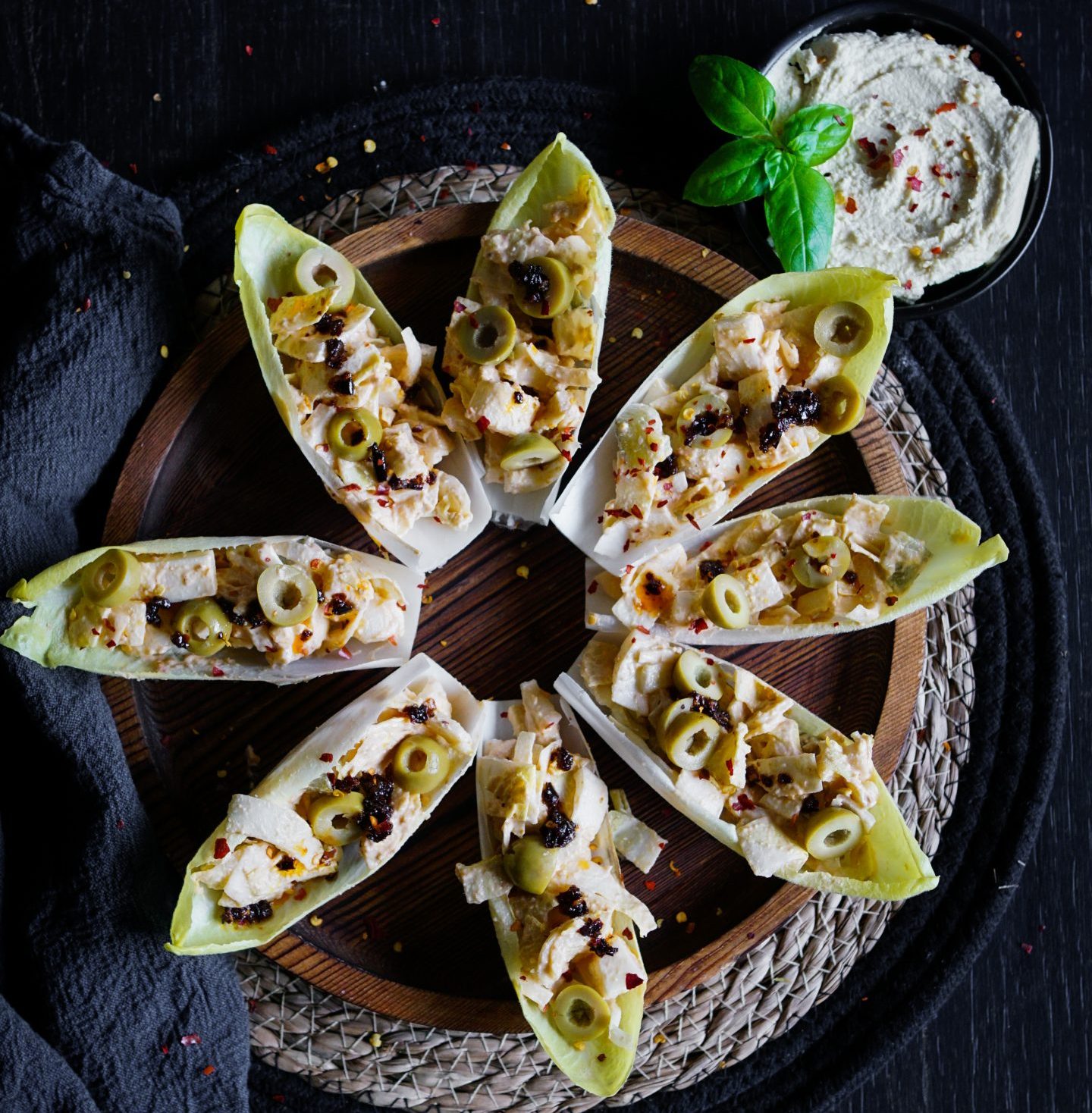 Deze witlofbootjes gevuld met rode pesto en hoemoes zijn een echte smaakmaker. De combinatie van zachte hoemoes, rode pesto en de lichte bitterheid van witlof zorgt voor een verrassend geheel. Afgetopt met olijven, chili vlokken en een vleugje crispy chili olie zijn ze perfect als borrelhapje of kleurrijk voorgerecht.